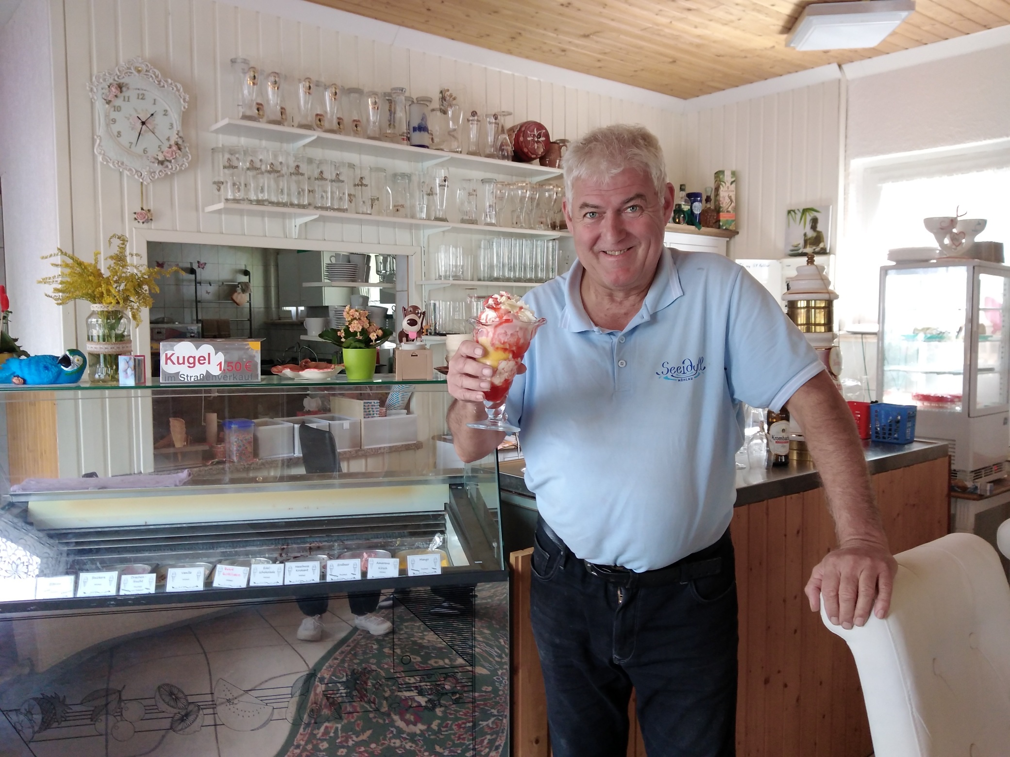 Unser selbst hergestelltes schmackhaftes Speiseeis kann im Sommer sowohl auf unserer Seeterrasse als auch im gemütlichen Gastraum genossen werden.